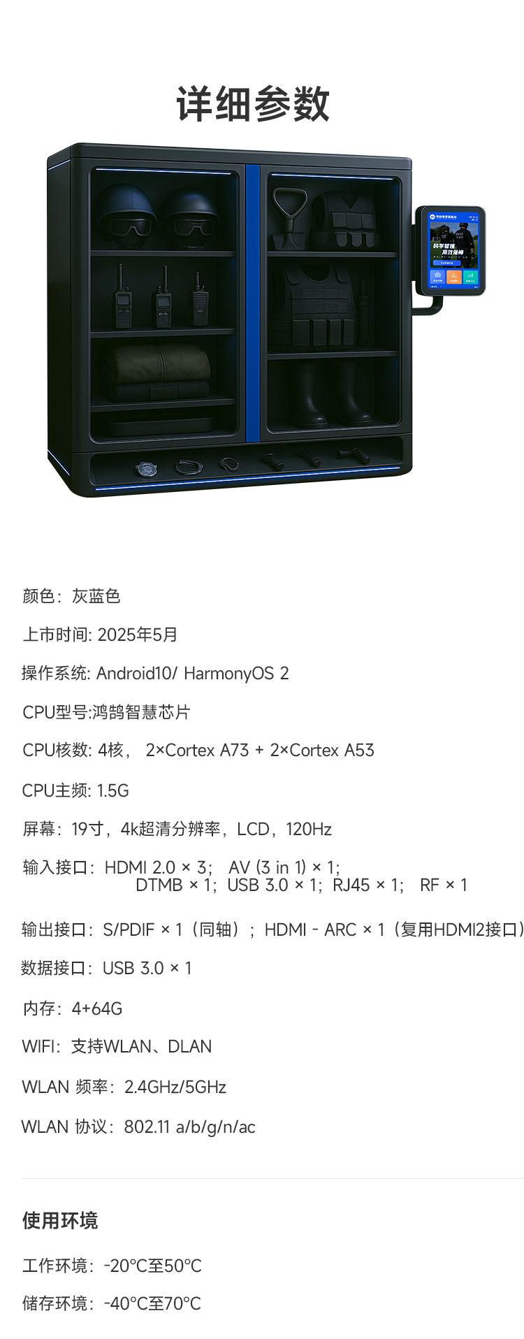 守边一线,装备先行。《凌讯智能装备柜-边防警察款》专为边防巡逻、缉私查缉、口岸执勤等高强度任务打造,集成装备识别、身份核验、智能控温、取还记录于一体,构建前线装备管理新标准。🏞 高适配:专柜配置边防常用装备位——执法记录仪、战术背心、对讲机、望远镜等精准收纳📲 智能开柜:刷脸 / 扫码即可开启,存取高效留痕📦 RFID追踪:装备取还状态实时感知,责任到人🌡 耐候设计:支持控温除湿,适应多种边境气候🔗 系统对接:可联动公安业务平台,形成数据闭环让边境防线的每一份装备,都有序、有据、可追溯。