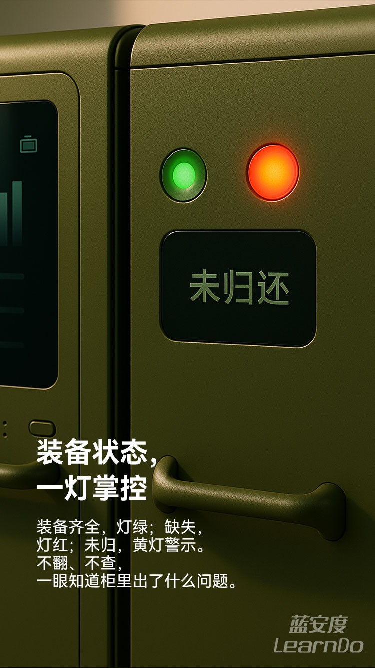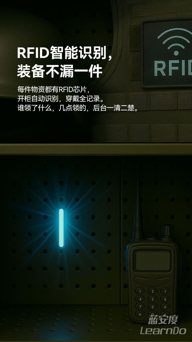 每件装备内嵌RFID芯片,柜内设置识别天线,自动识别“谁取了什么、什么时候取”,无须人工登记,杜绝丢失。