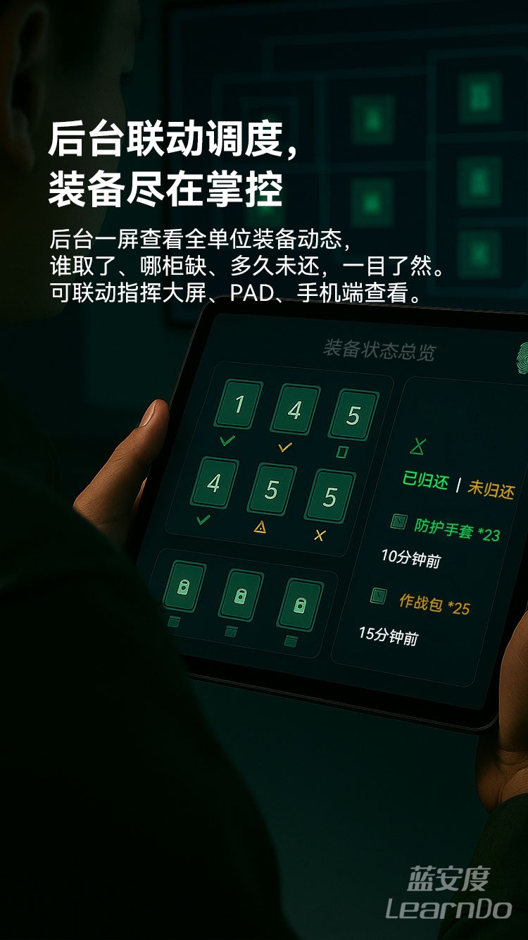 智能战斗装备柜,专为部队、武警、特警等高机动单位打造,集“统一存放 + 快速整装 + 自动盘点 + 安全管控”于一体。