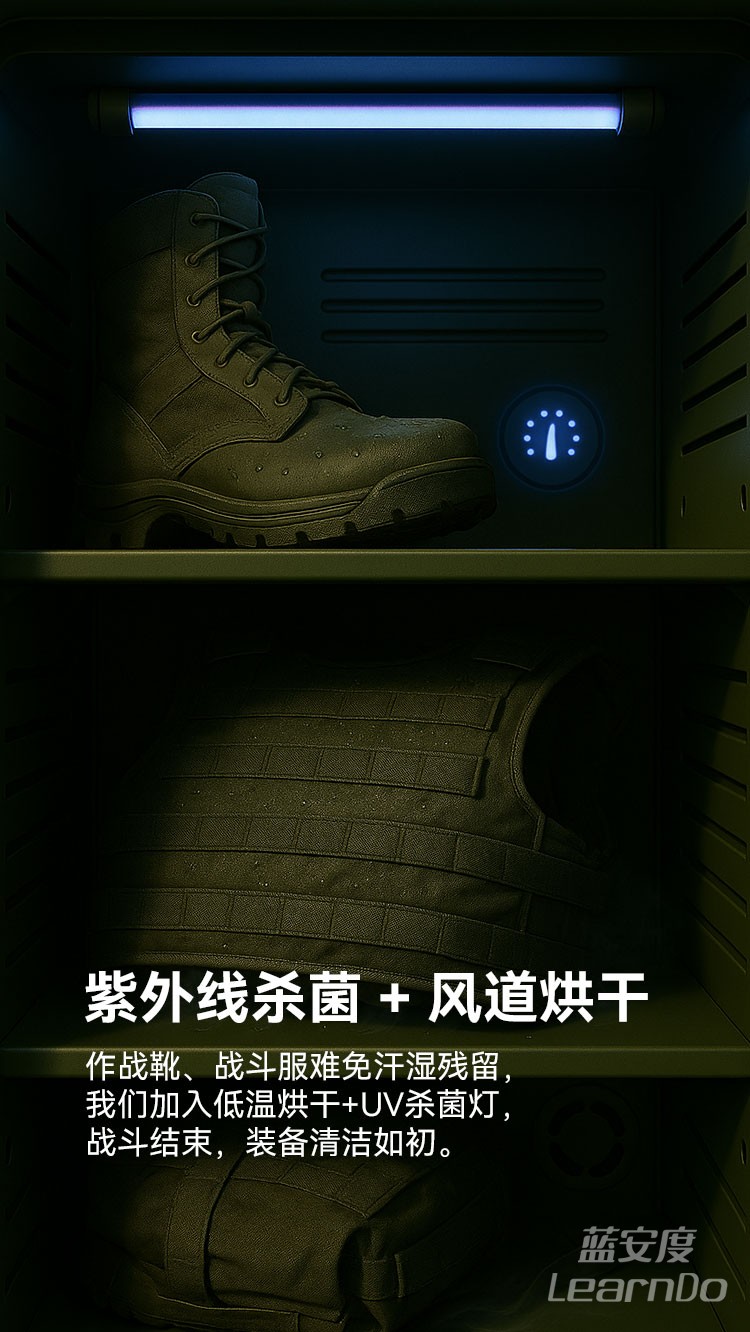 内置UV杀菌灯和微循环风道,可对战斗服、作训靴进行除菌除湿,保持干爽整洁。