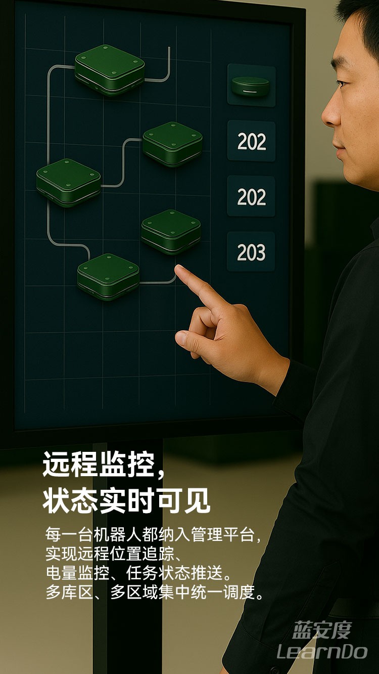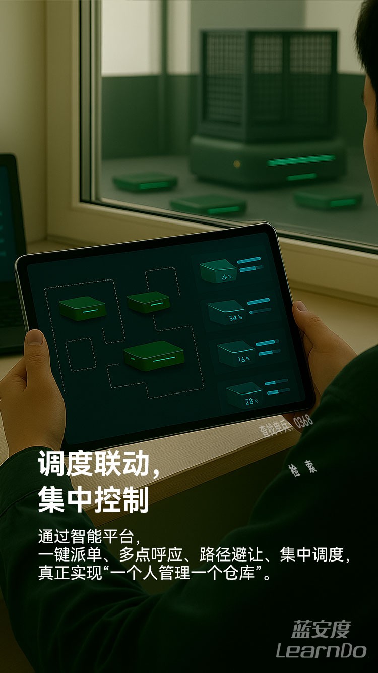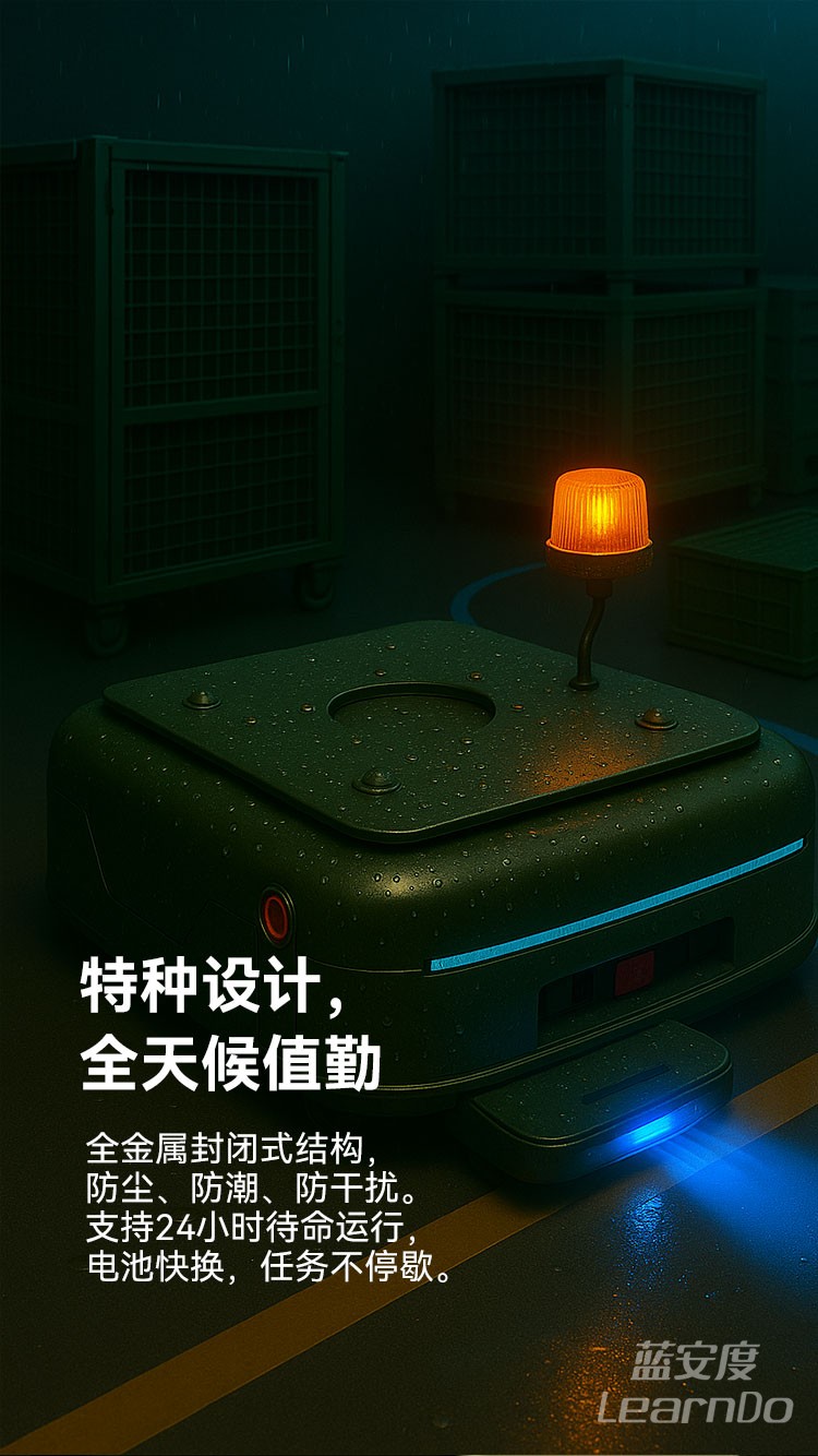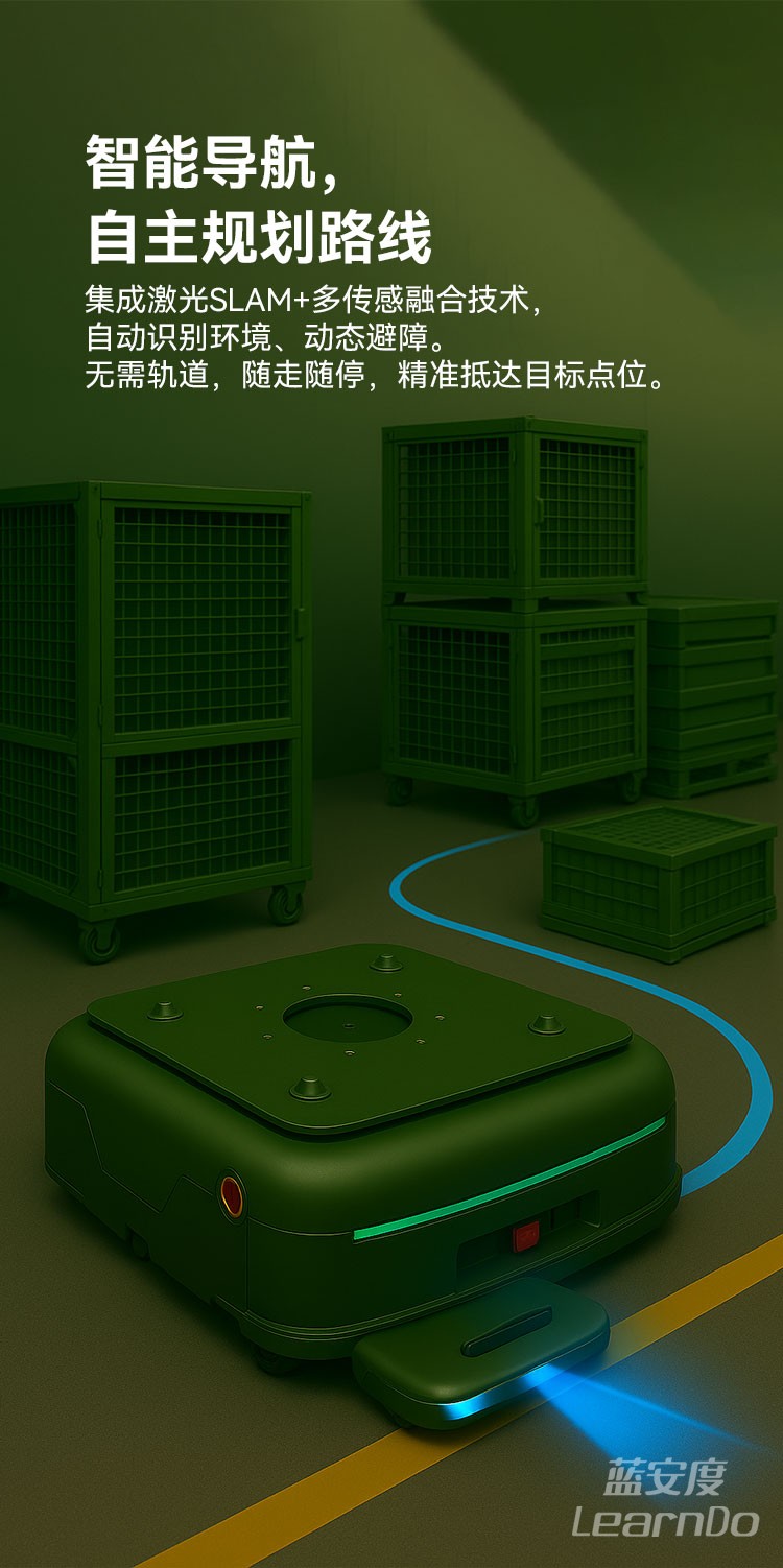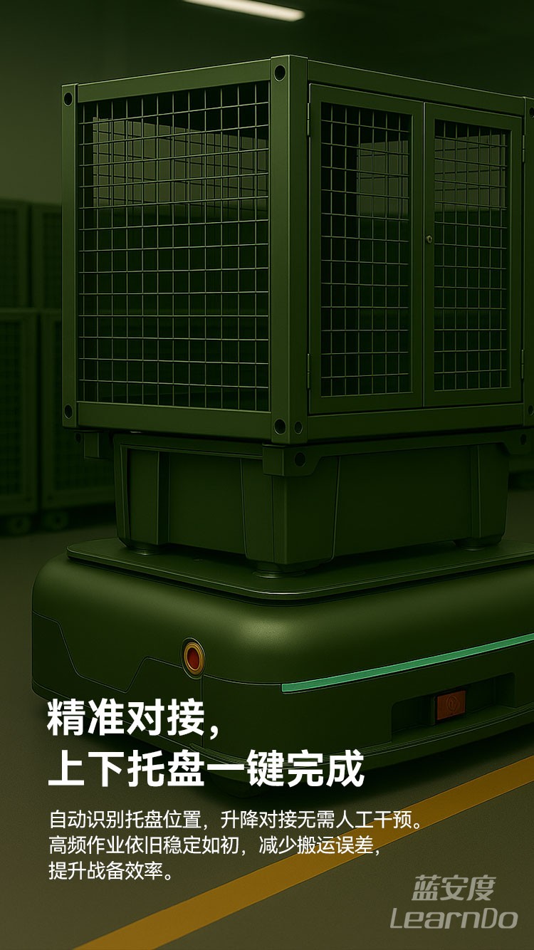 这款机器人采用低姿态潜伏结构设计,可精准对接军用物资笼、装备托盘,具备自主导航、路径规划、动态避障、集中调度等多项功能。整机使用军绿色隐身涂层,支持全天候任务运行,适配复杂仓储环境。